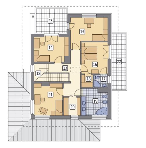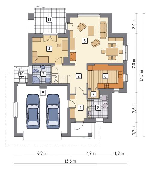 Общая площадь 229,4 м2Площадь дома 172,0 м2Площадь застройки 166,8 м2Кубатура 947,5 м3Угол наклона крыши 20°Высота дома в коньке 8,41 мВысота помещений первого этажа 2,72 мВысота этажа 2,56 мГараж/навес (стояночные места) 2Количество комнат (с гостиной) 6Минимальные размеры участка 21,5 x 22,7 мНеобходимые размеры участка 21,5 x 22,7 м